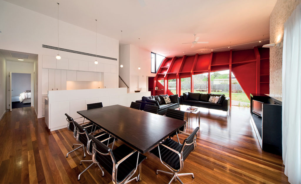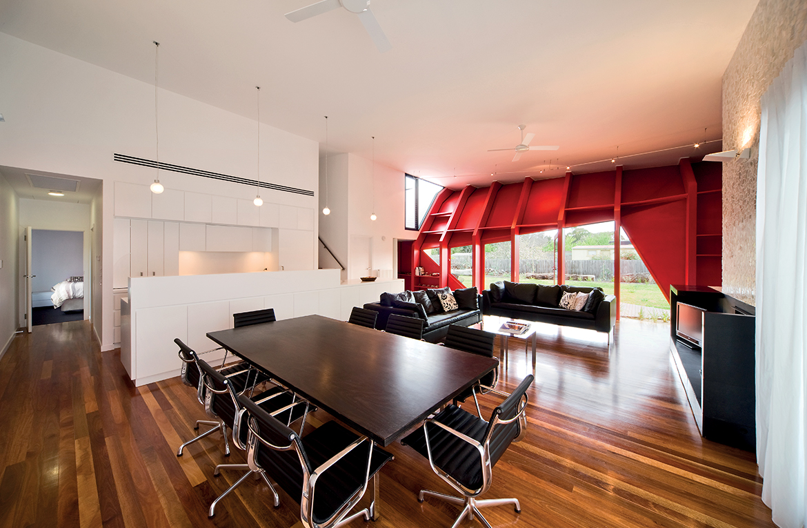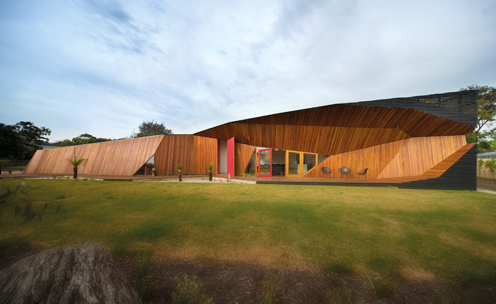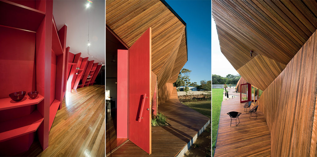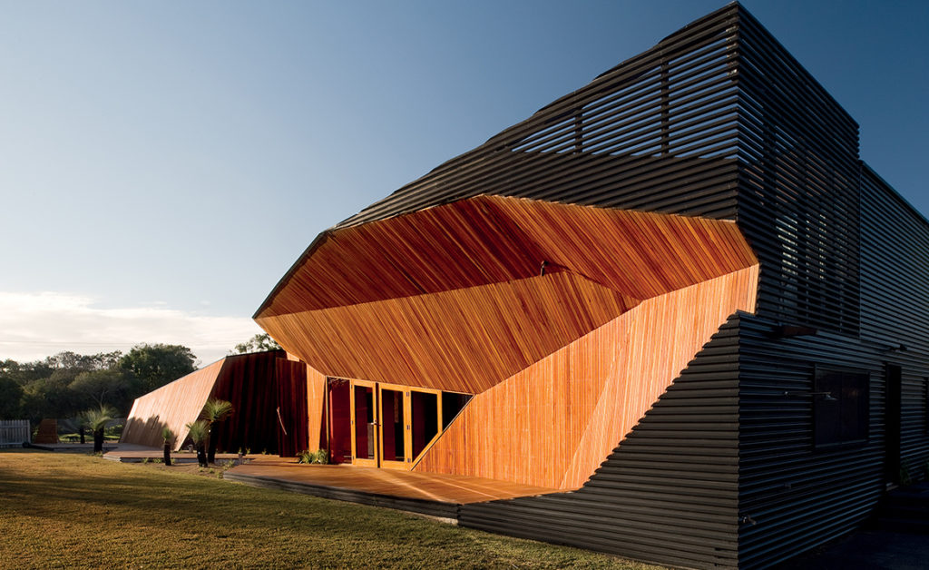 PORODIČNA KUĆA ZA ODMOR U AUSTRALIJSKOM GRADIĆU BLERGAURI, KOJI SE NALAZI NA ŽIVOPISNOM POLUOSTRVU MORNINGTON, ODLIKUJE SE IZUZETNO SPECIFIČNOM UPOTREBOM DRVETA. DRVO NIJE SAMO DOMINANTNI GRAĐEVINSKI MATERIJAL I GLAVNO SREDSTVO ZA STVARANJE LIKOVNOSTI, VEĆ JE UPOTREBLJENO I KAO OGLEDALO I ZAPIS AMBIJENTA. PAŽLJIVO ODABRANOG KOLORITA I SLOGA, ONO U SEBI SUBLIMIRA POETIKU SVOG LOKALITETA, NJEGOVU GEOLOŠKU FORMULU, KAO I ORIGINALNU AUTORSKU FILOZOFIJU.