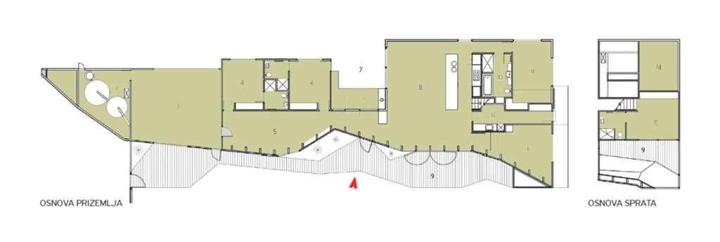 Osim što izostaje jasno definisan ulaz, građevina nema ni klasičnu podelu po fasadama. Jedan korpus eksterijera, onaj orijentisan tako da najbolje iskoristi dnevni hod sunca, materijalizovan je kao „zlatna strana“ – obložena u potpunosti drvetom toplih tonova, koji svojom bojom asociraju na pesak, sunce i stene, a svojim ritmom na vetar, talase i promenljivost neba. Predviđeno je da se celokupni život odvija u dvorištu iza kuće, budući da svojom formom i funkcijom ceo njen zadnji deo nosi ulogu verande.