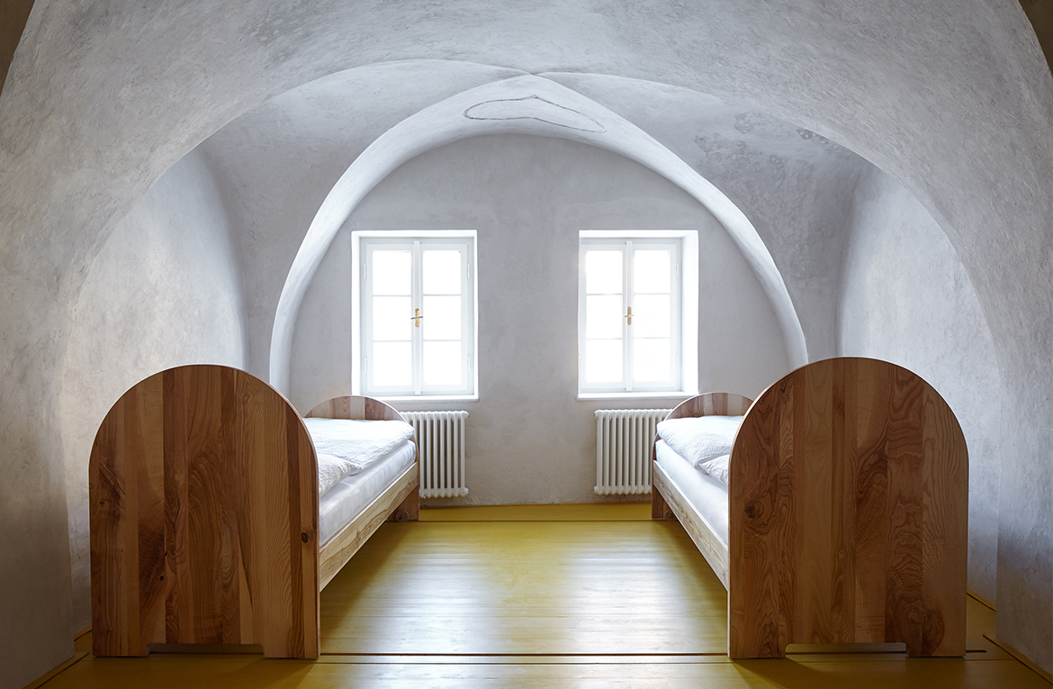 Enterijer je rađen sa težnjom da se sačuvaju sve zatečene forme – oblici prostorija, zidarski otvori, lučni svodovi. Ove površine su obojene u belo, što nije umanjilo njihovu prepoznatljivost, a na taj način postale su savršena pozadina za zanimljiva dizajnerska rešenja. Nameštaj i oprema izrađeni su od bravarije i drveta, i ma koliko da svojom materijalizacijom evociraju istorijske epohe, ipak otkrivaju i savremeni minimalizam koji ne želi da zatrpa prostor, već ga ispunjava tek da bi nagovestio njegovu namenu. Krevet sa baldahinom od bravarije, luster od istog materijala koji je apsolutno savremen, kreveti koji se klizeći po šini mogu spajati i razdvajati, sanitarije i pločice u kupatilima – samo su neki od detalja koji otkrivaju moderni dizajnerski rukopis. Sa druge strane, uska stepeništa, nepravilni oblici zidarskih otvora, uski prozori – badže, otkrivaju nesumnjivo istorijski karakter kuće.