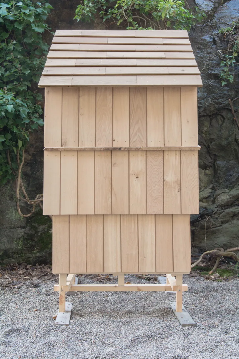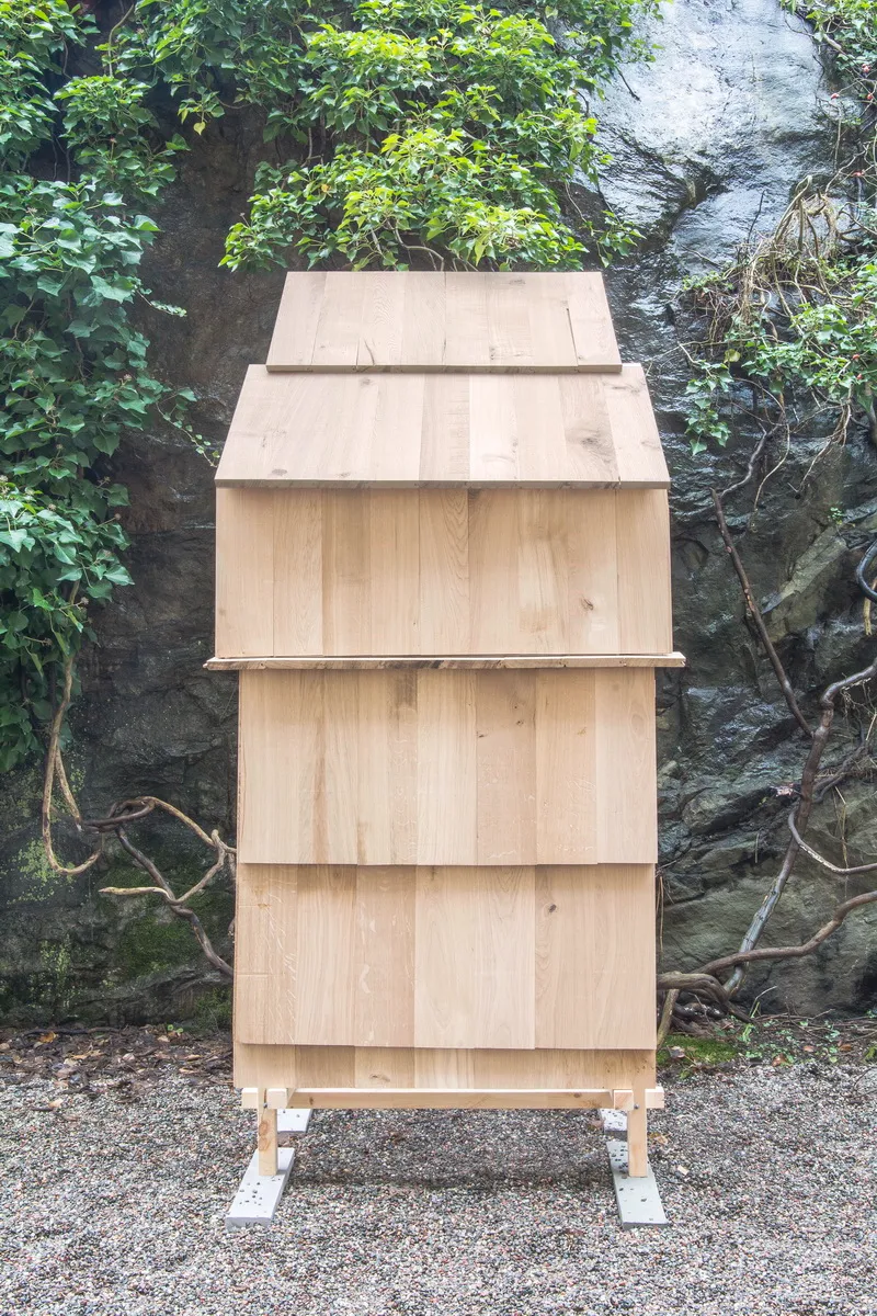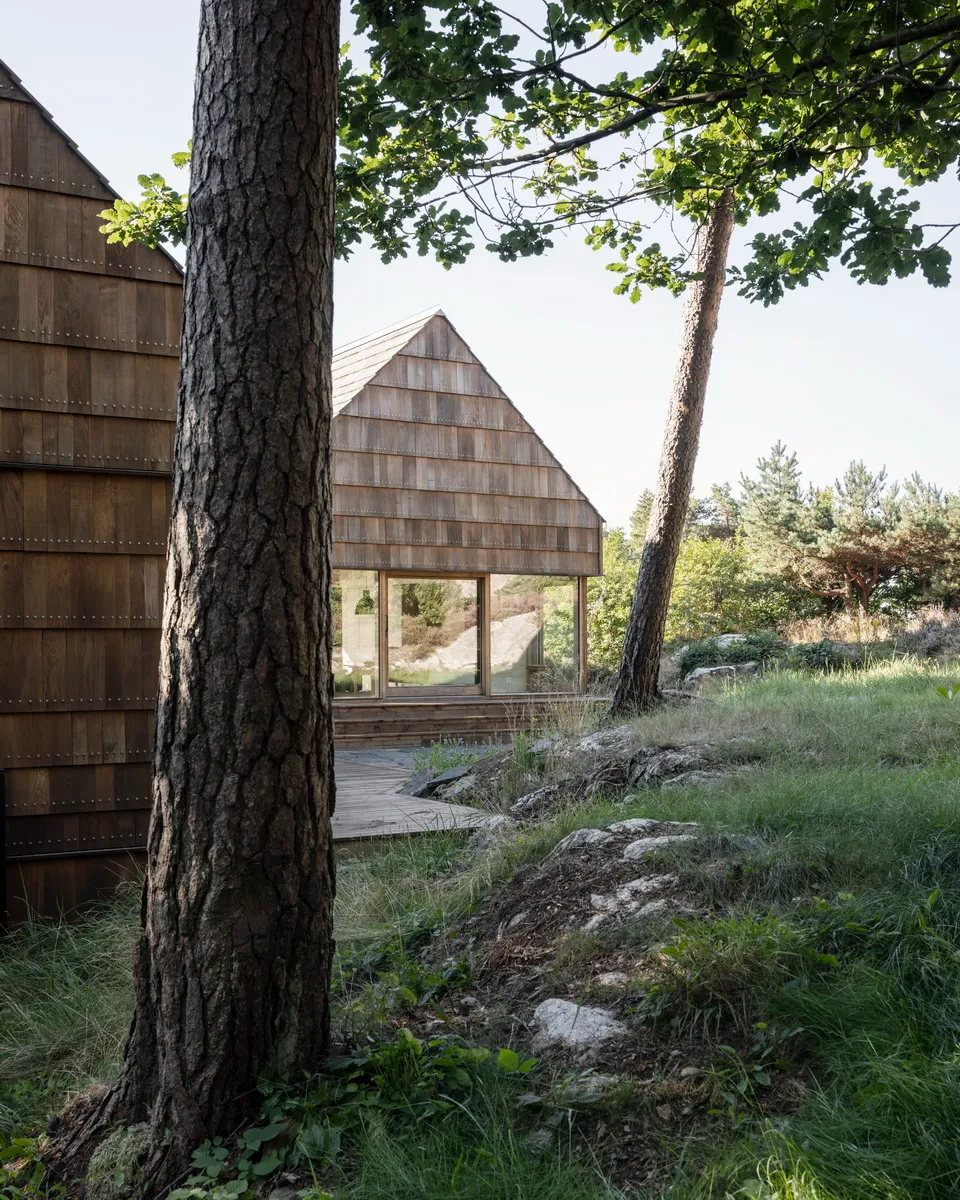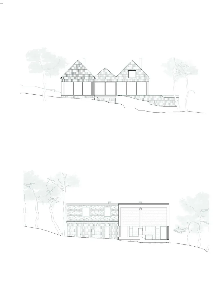 SPOLJNA HRASTOVA OBLOGA VREMENOM ĆE POSTATI SREBRNO-SIVA I STOPIĆE SE SA PEJZAŽEM OD ŠKRILJCA I GRANITA, ŠTO OTVORENO ASOCIRA NA PROLAZNOST I STARENJE. KUĆA TAKO DOBIJA ATRIBUTE ŽIVOG ORGANIZMA ČIJI VIZUELNI SPEKTAR NAVODI NA PREISPITIVANJE IDEJE O KONAČNOSTI I STALNOSTI NASPRAM PROMENLJIVOSTI.