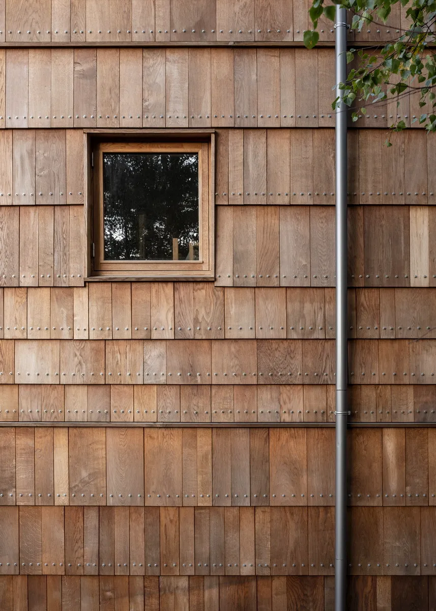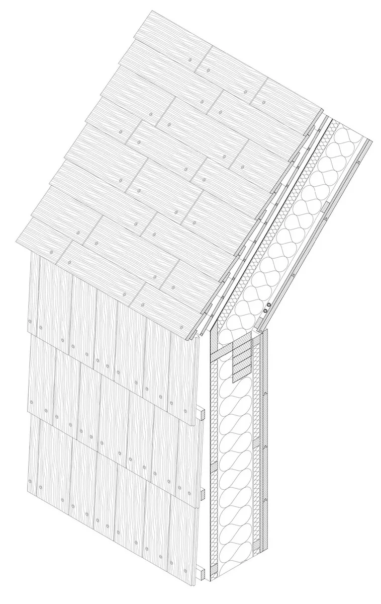 Na fasadi je preko 12.000 delova, prethodno izbušenih i tretiranih katranom, dok slojevit karakter obloge pojačavaju vijci od nerđajućeg čelika.