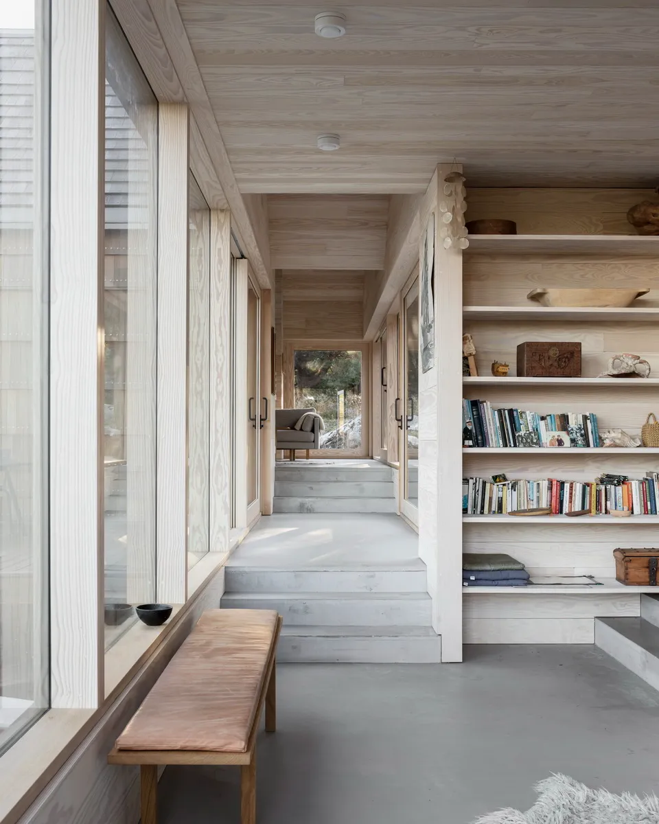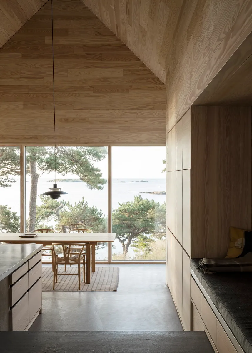 U unutrašnjosti, svaki prostor ima drugačiju visinu plafona, a kroz centralni hodnik se pruža jasan pogled na sve delove enterijera. On se proteže u pravcu mora i donosi jedinstvo i koherentnost na različitim nivoima. Prisutnost drveta kao prirodnog materijala aktivna je komponenta oblikovanja koja doprinosi autorovoj težnji da jedinstvenost i integralnost arhitektonskog izraza koincidira u svim složenostima pojedinačnih elemenata.