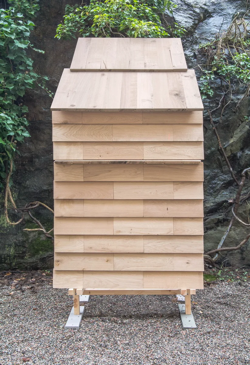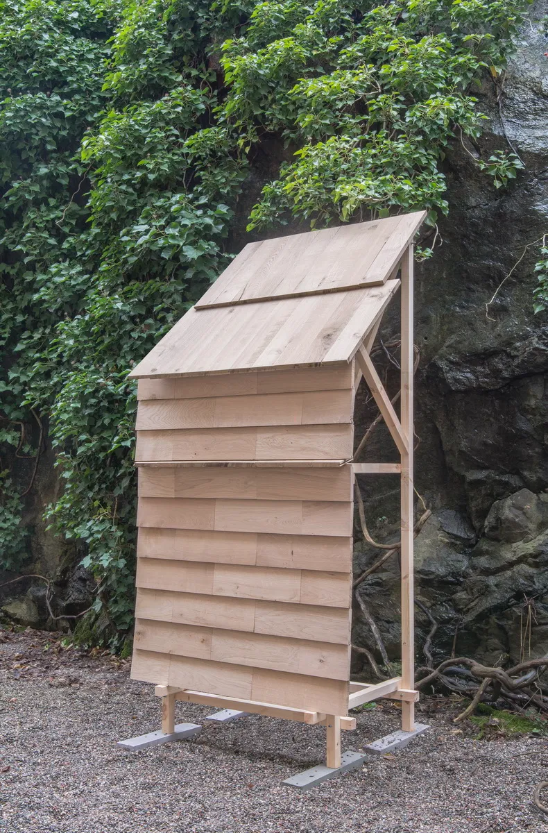 Prirodni ljudski afinitet prema redu i ritmičnoj repeticiji došao je do izražaja na fasadi, na koju su postavljeni ostaci Dinesen materijala prethodno korišćenog u proizvodnji podova po meri. Interesantna ideja pravljenja zgrade od ostataka, manifestuje kreativnost upotrebe otpadnog materijala koji bi se inače koristio kao ogrevno drvo. Osim što su prirodni i dopadljivi, rezovi sadrže manje ugljenika i dobra su zamena za korišćenije materijale sa više ugljenika.