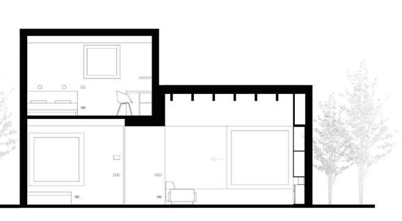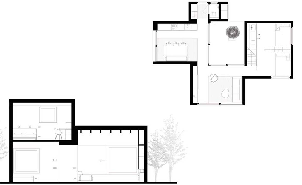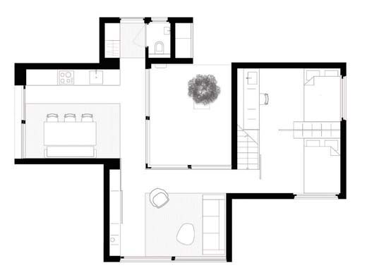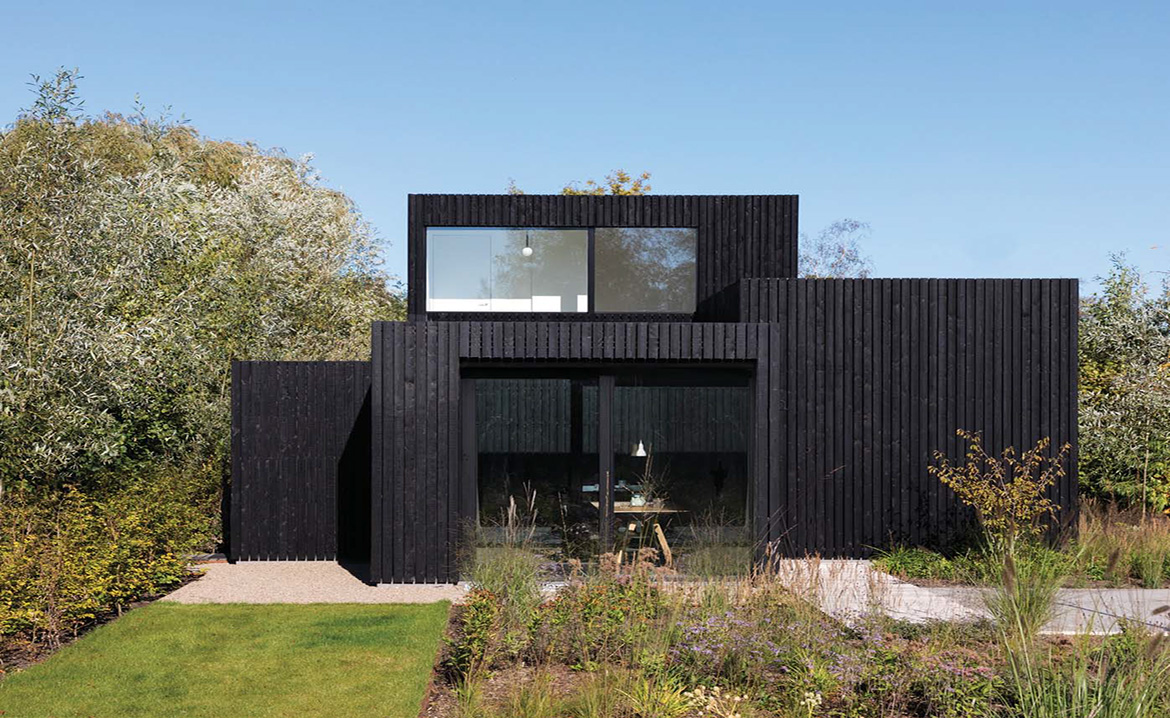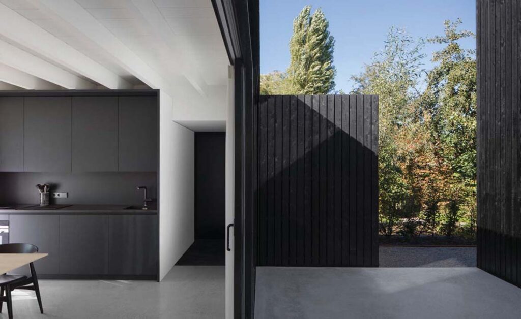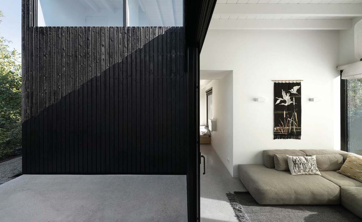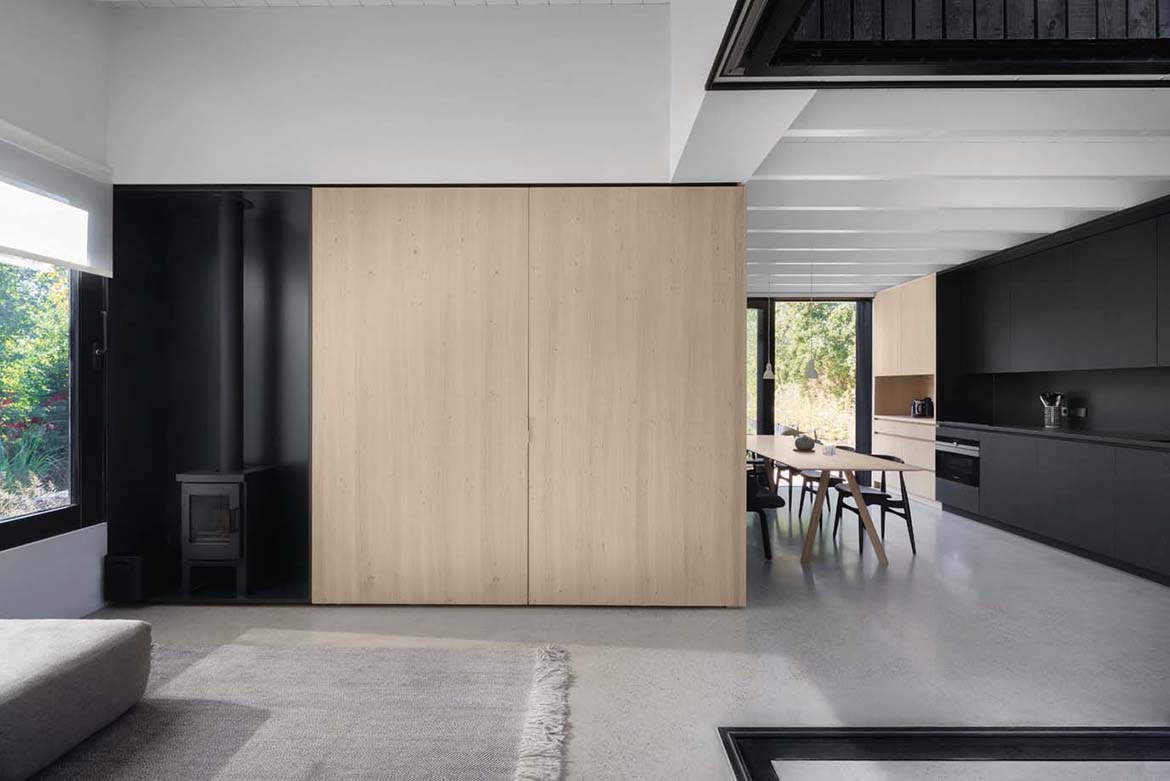 Unutrašnji prostor je takođe tretiran kao skluptura. Opet su dinamika i ritam glavni katalizatori kompozicije – dimenzije i visine plafona su različite, te ovako definisani volumeni jasno artikulištu odvojene prostore i njihoe funkcije u kući. Otvaranjem velikih kliznih vrata, kuhinja i dnevni boravak postaju ne samo vizuelno, nego i fizički povezani. Nameštaj pravljen po meri i ugradni ormari dodatno naglašavaju kvalitet komfora i princip adaptibilnosti u domu.U projektu su korišćeni jednostavni materijali, sa naglaskom na njihovom prirodnom poreklu. Drveni paneli od prirodnog hrasta su ili bez boje ili su obojeni u crno, a kombinovani su sa grubom fasadom od borovog drveta i uglančanim podom. –ek MARE JANAKOVA GRUJIĆ u EKO KUĆI No40