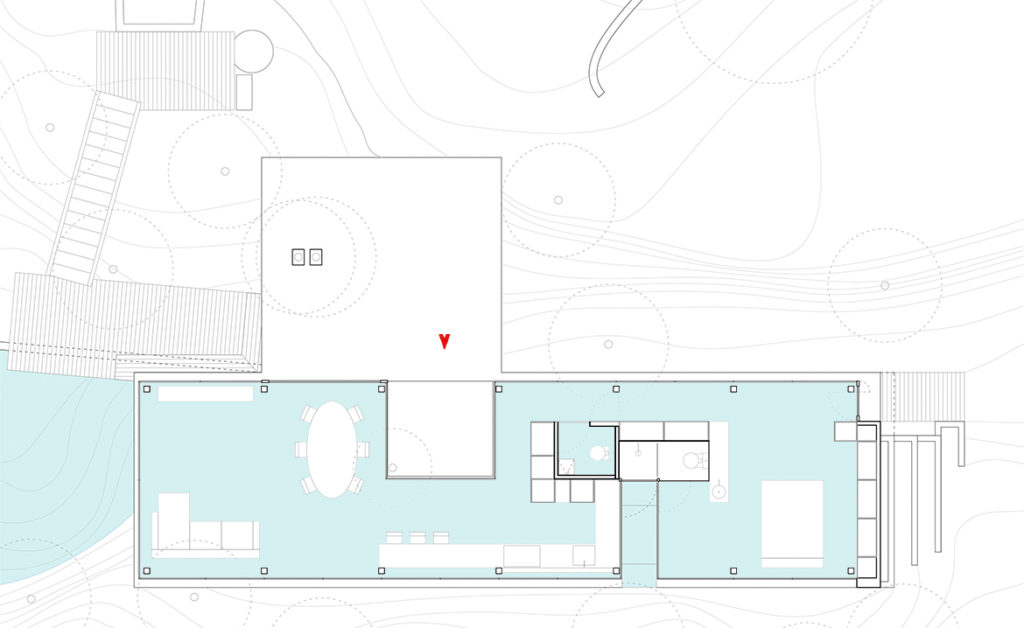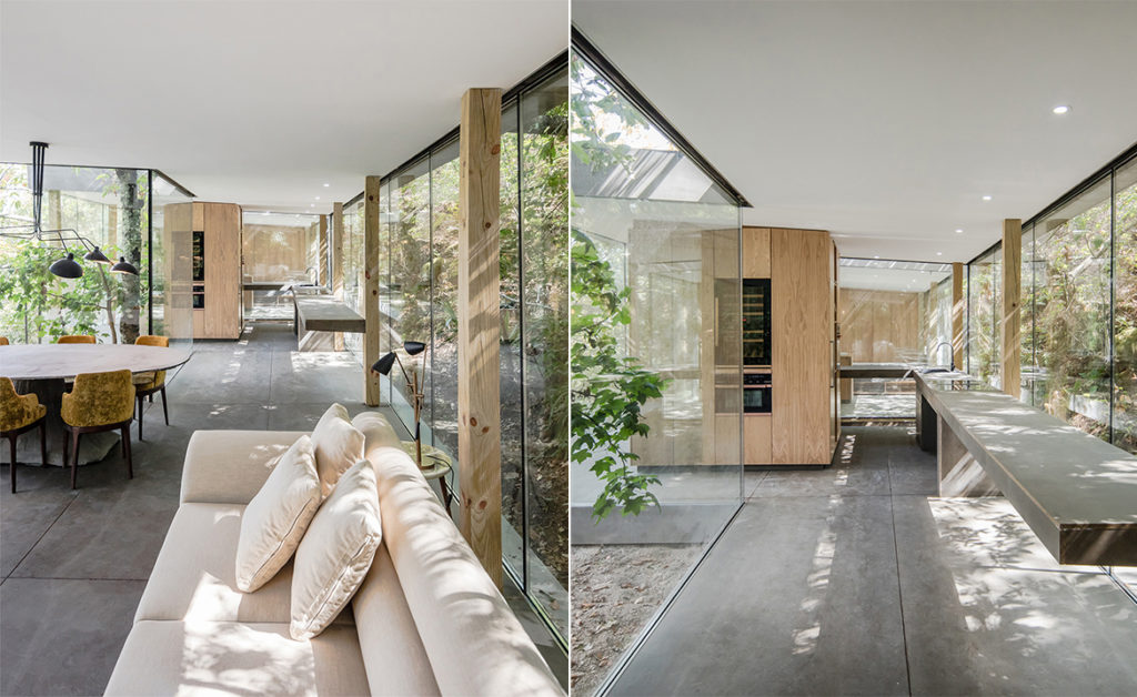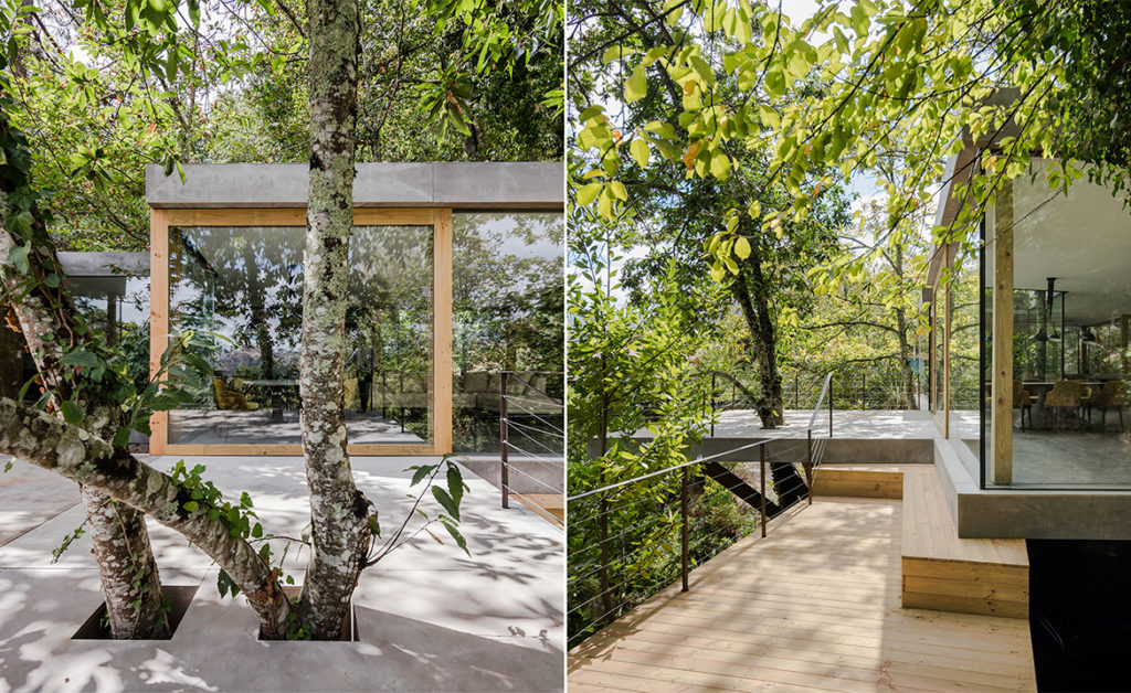 Projekat ovog zanimljivog zdanja potpisuje portugalski arhitekta Ernesto Pereira ispred svog studija „3r“. U kontekstu postavke da se organska arhitektura ne bavi samo pitanjima životne sredine već i ljudskim duhom, ova šumska kuća je daleko više od pukog skloništa – ona oblikuje naš duh i sjedinjava nas sa prirodom. Arhitektura u kojoj se šuma ogleda i kroz nju nesmetano prolazi , u svakom svom detalju nastala je sa ciljem konzumiranja drveća, vaduha i sunca. Klasični zidovi u potpunosti izostaju, čime se poništava vizuelna granica između spolja i unutra. Staklo je jedini materijal opne objekta nadvišenog ravnim peščanim krovom koji ima ulogu terase-tla. Da bi se korisnicima omogućilo uživanje u mirisima, bojama i zvucima prirode, kompozicija je po horizontali raščlanjena terasama.