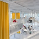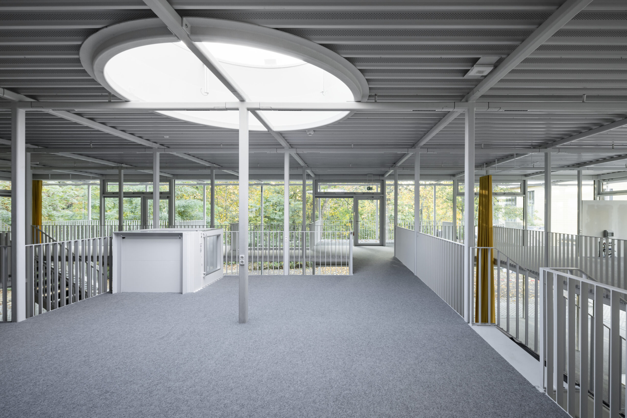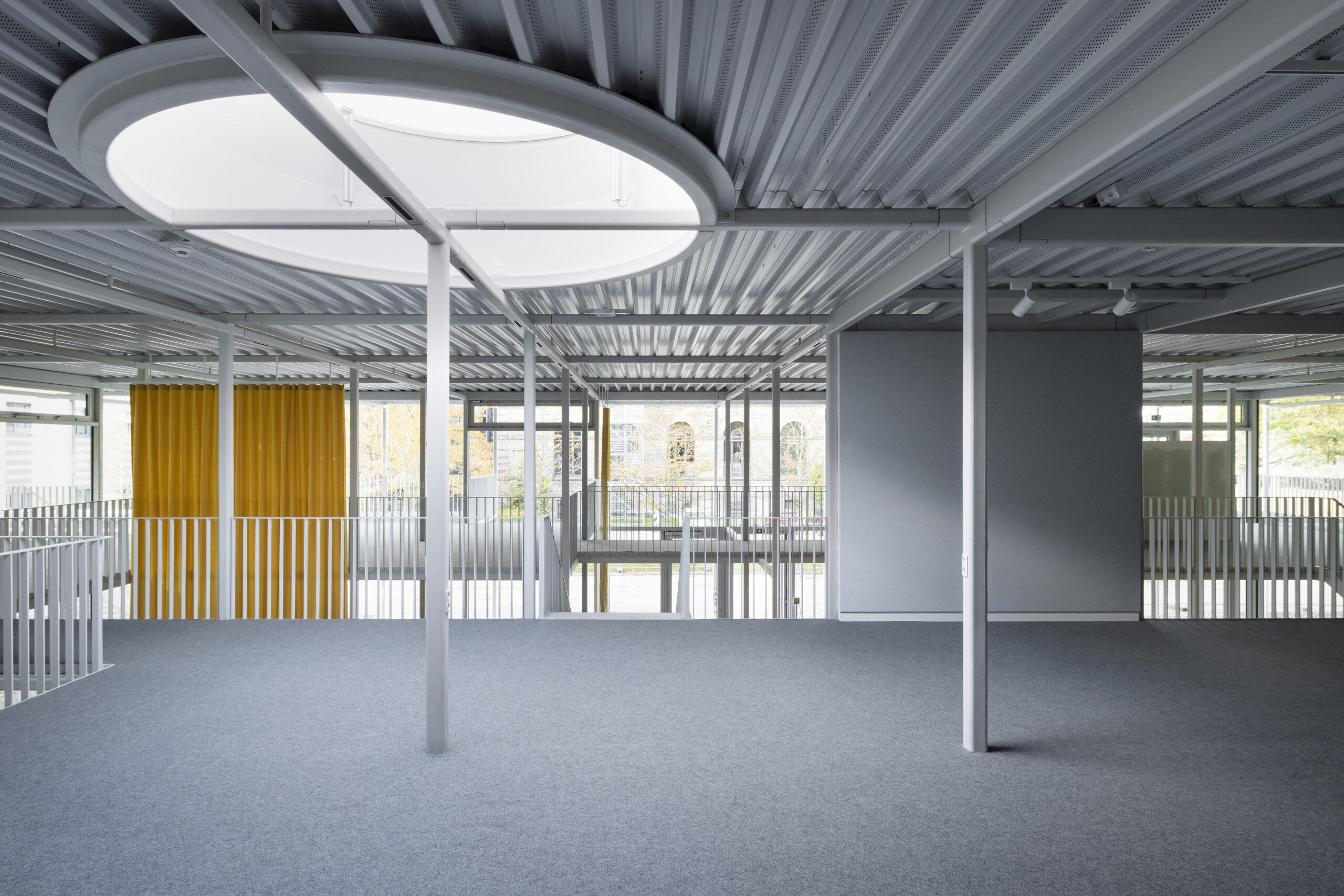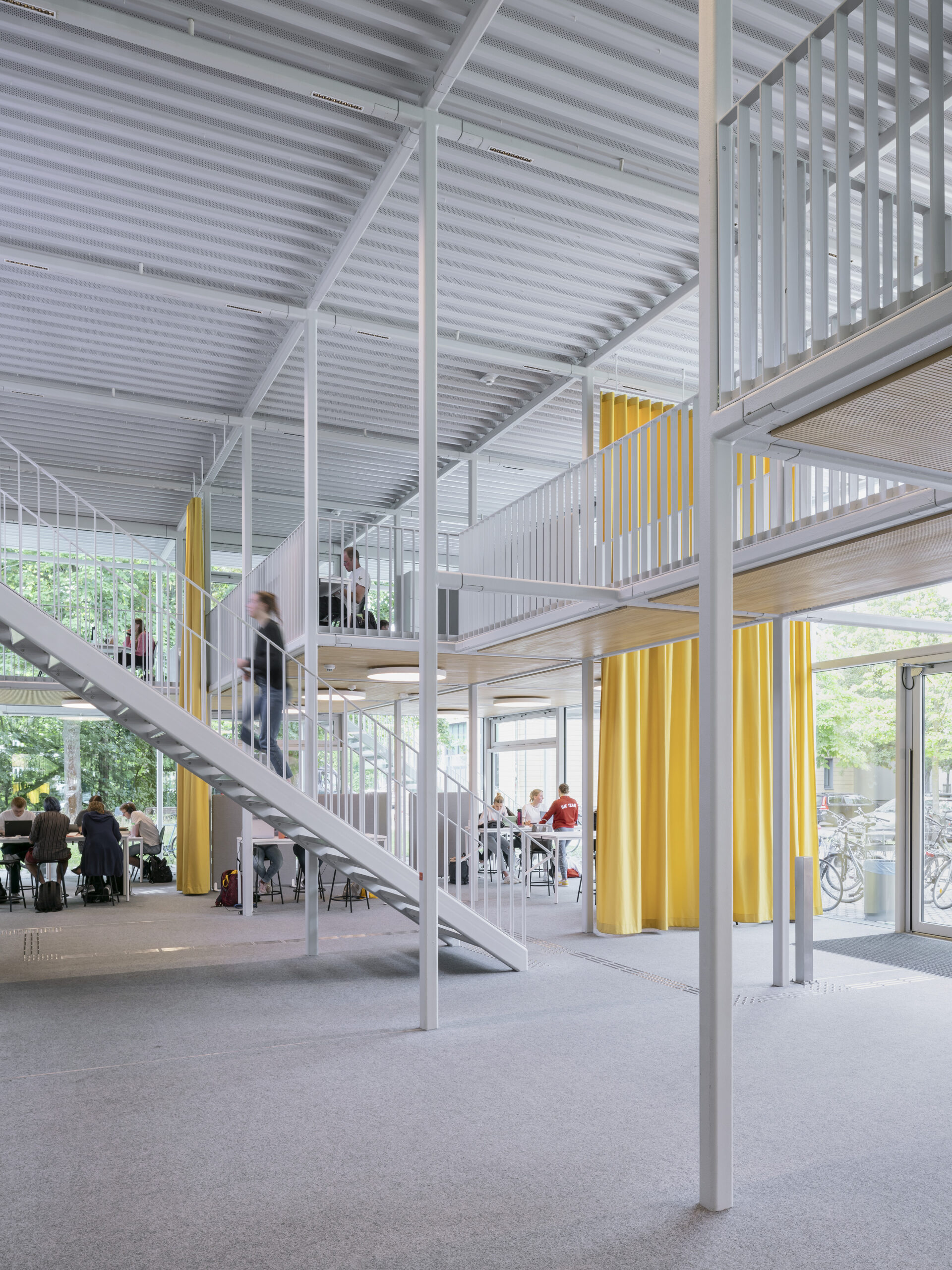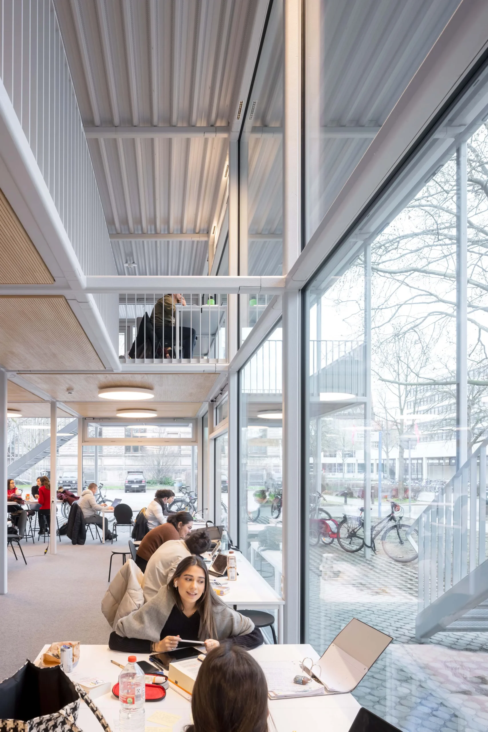 Paviljon obuhvata različite zone, od prostranih dvostruko visokih čistina koje podstiču na kreativno razmišljanje, do intimnih prostora gde studenti mogu da se osame i rade u miru. Ovaj pristup stvara fleksibilno i podsticajno okruženje koje se lako prilagođava različitim potrebama korisnika.