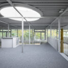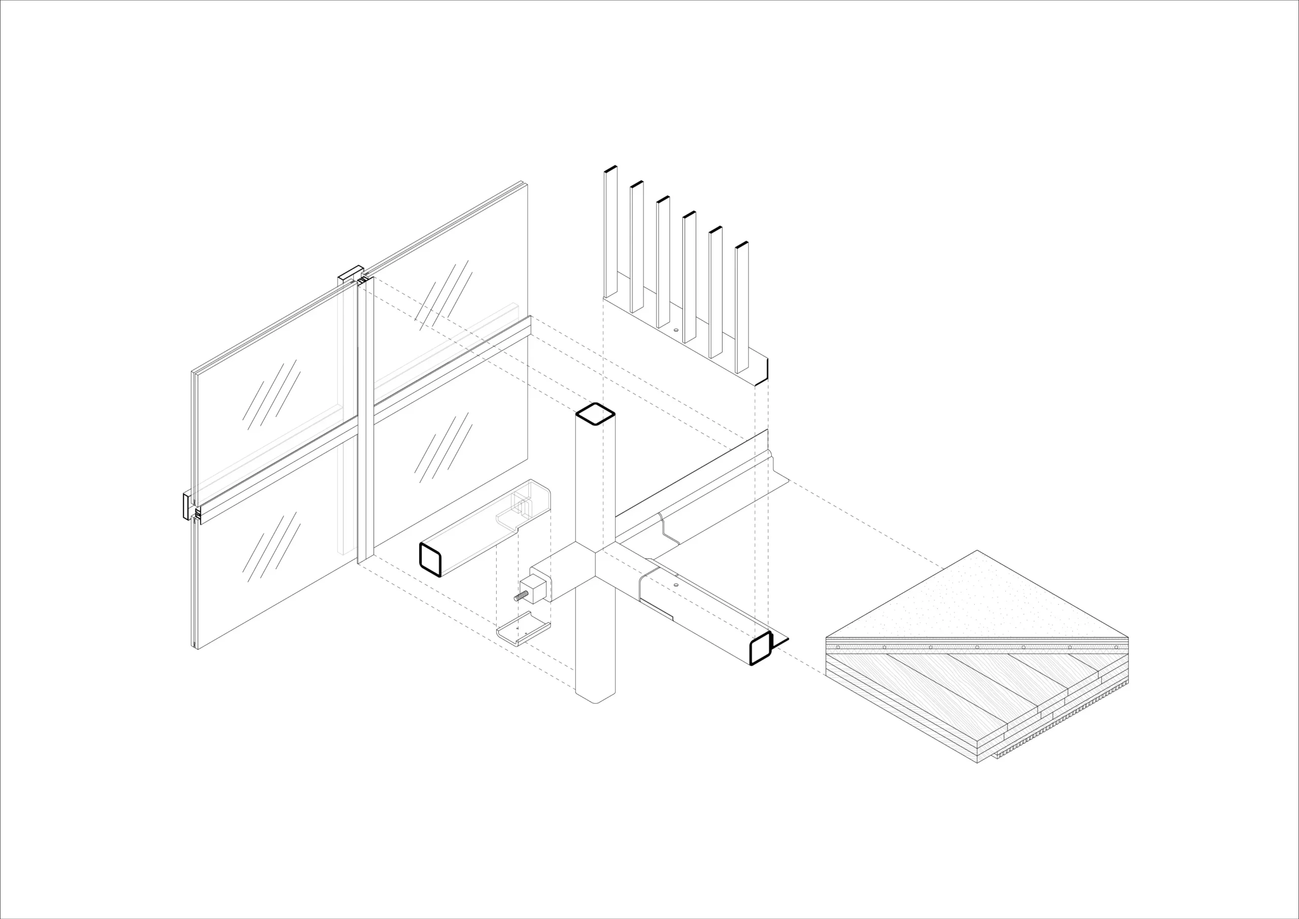 Prirodna ventilacija kroz nagibne prozore i centralnu svetlosnu kupolu doprinosi ugodnoj unutrašnjoj klimi. Utičnice, rasveta i kablovska instalacija su diskretno integrisani u strukturu zgrade, čime se obezbeđuje maksimalna funkcionalnost uz minimalan vizuelni uticaj.