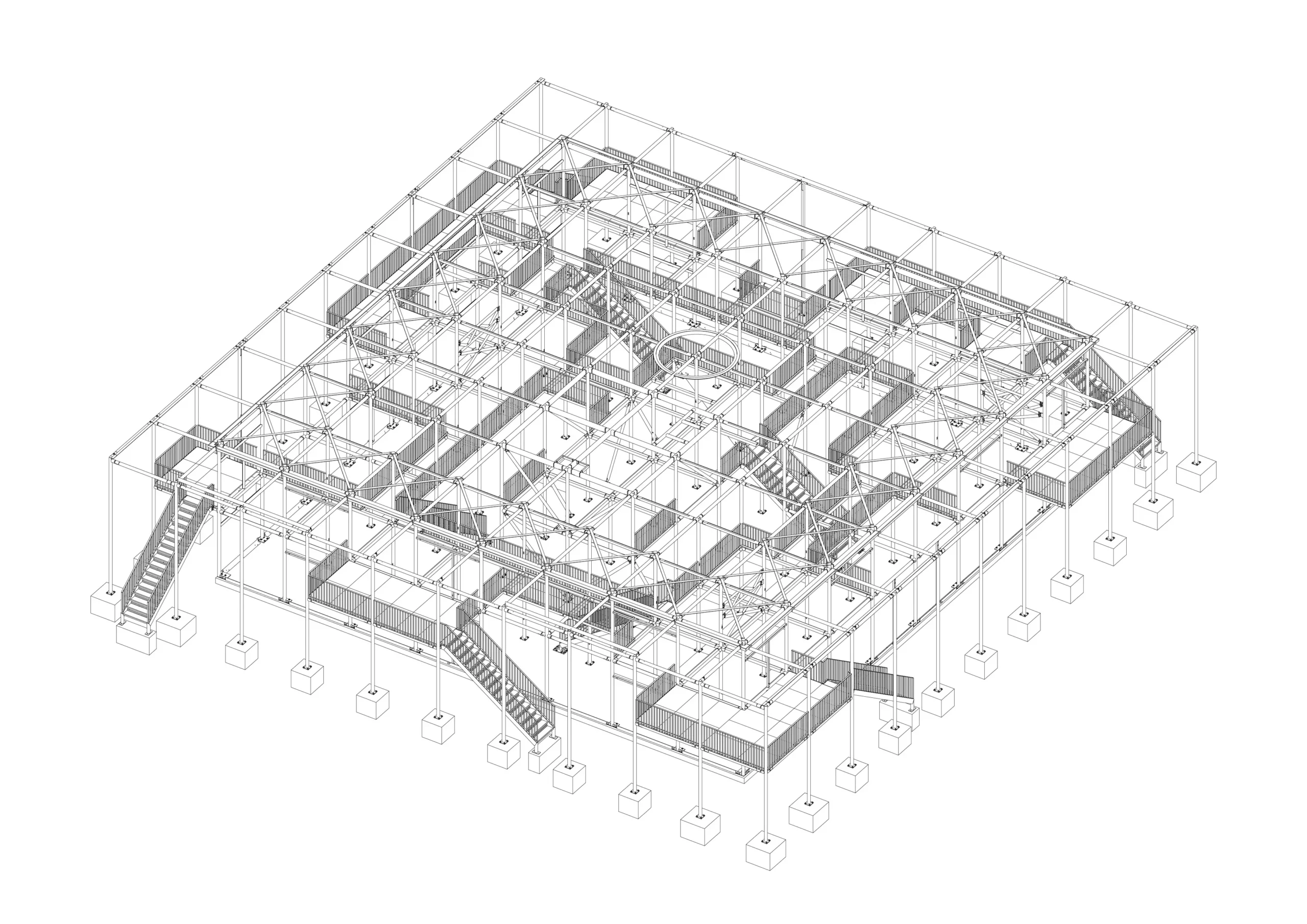 Struktura paviljona osmišljena je sa namerom da pruži maksimalnu fleksibilnost i prilagodljivost, naglašavajući koncept modularnosti i efemerne arhitekture. Modularni dizajn sa osnovnom mrežom od 3 x 3 metra omogućava rekonfiguraciju prostora u skladu sa potrebama korisnika. Inovativnu hibridnu konstrukciju od čelika i drveta moguće je demontirati i ponovo sastaviti. Zahvaljujući takvoj konstrukciji paviljon se može dopunjavati, menjati ili premestiti bez gubitka funkcionalnosti.